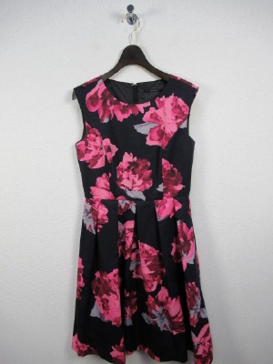 インパクトのあるピンクの花柄プリントワンピース。 オーソドックスな切り替えワンピースですが メリハリのあるプリントがこれだけで オシャレなお出かけ着の要素をそなえています!