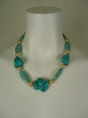 刺繍がかわいいワンピースを、カギ針ニットでナチュラルに。ターコイズ色のアクセで少しエスニック!フェミニン度80%、アクティブ度20%。