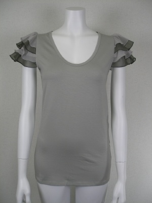 グレーのカットソーと黒のスカートを華やかに見せるオレンジ色のアクセサリー。スカートのインナーともさりげなく色をリンクさせて!エレガンス度70%、フェミニン度30%。