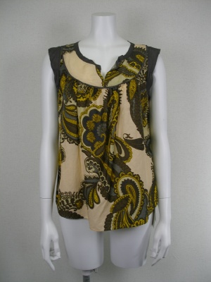 インパクト大なペーズリー柄はとことんシンプルに着こなして。ゆったりしたノースリーブは腕を華奢に見せてくれますよ!スタイリッシュ度80%、アクティブ度20%。