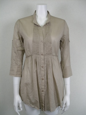 | スタイリッシュ・モダン (丈長のシャツは羽織として着こなす)襟無しの長袖シャツは丈長なのでパンツの上に羽織として合わせると重宝です。温度調整のしにくいこの季節にぴったりな一枚。 | |