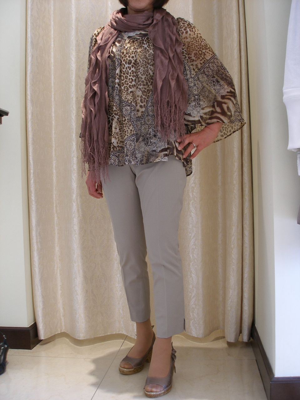チュニックと短丈のパンツが良く似合ってます。ウインドーのコーディネートを気に入って頂き、ご試着頂きました!