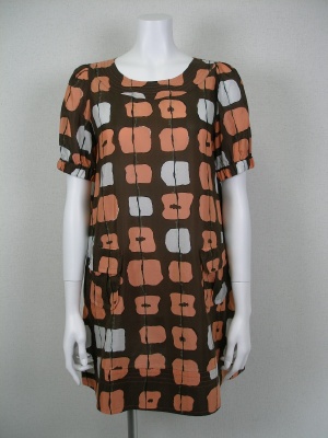 レトロ柄のワンピースはストンとしたシルエットがカワイイ。クロプトパンツでカジュアルに着こなしても上品です!フェミニン度90%、アクティブ度10%。