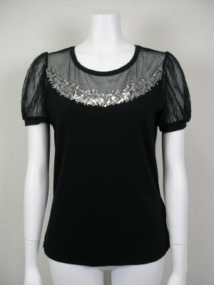シースルーとスパンコールが大人っぽいカットソーはノーアクセサリーでじゅうぶんです。でもウエストマークの太ベルトは忘れずに!エレガンス度70%、スタイリッシュ度30%。
