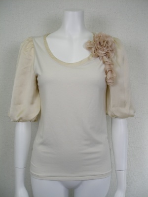 カットソーはコサージュ付き、取り外しができます。お袖がバルーンになってとてもキュート。お出かけが楽しくなります!フェミニンl度100%、