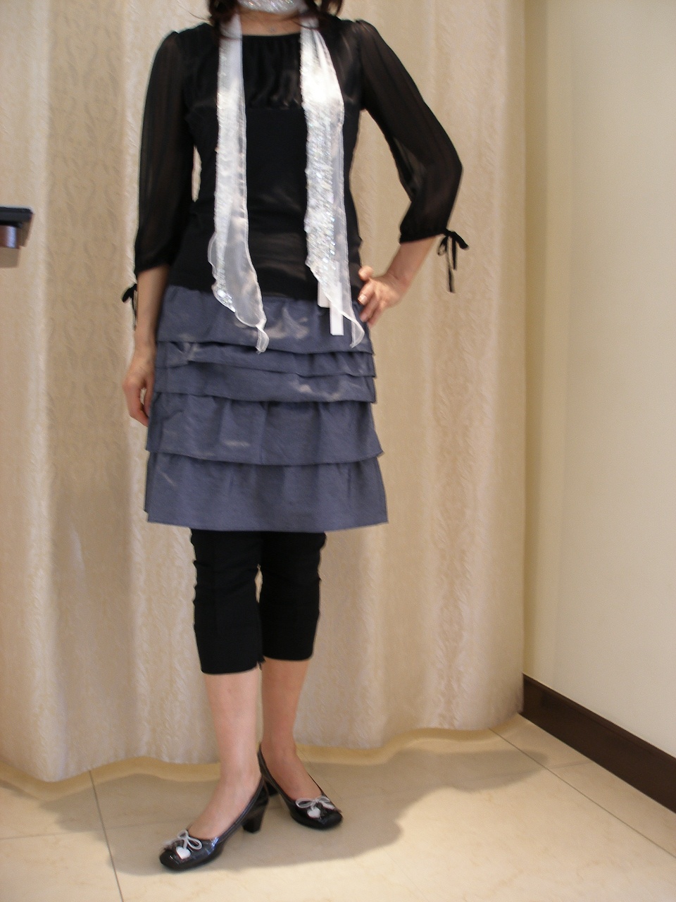 スタイルの良いS様。ティアードスカートにチャレンジして頂きました。下にレギンスをはいてバランスをとりました。さらにストールがこの日のポイント。いろんなものに、このストールを合わせるだけでとても良いスパイスに!「今日のヒットはこれだね」とS様も絶賛!