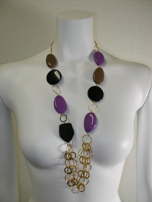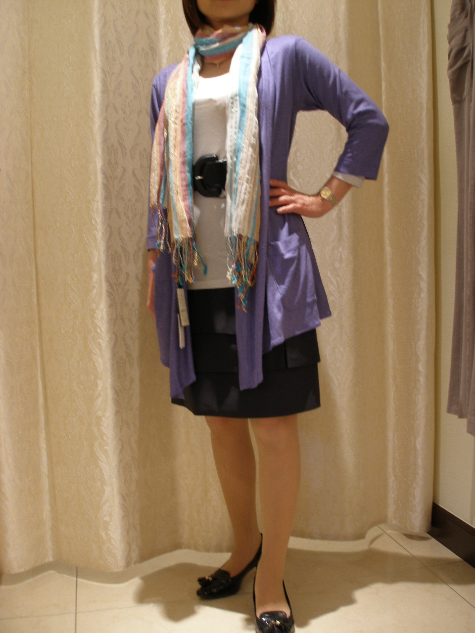柄物が少々苦手なN様。春なので明るい色をとのことで、パープルのカーディをお勧め。ストールとの色も綺麗にお似合いです!