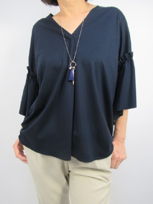 腰にゆとりを持たせたティーパードパンツはトップスの丈を短めに。そして少しボリュームのあるゆるっとしたデザインが良く合います。ベージュ×ネイビーでシンプルコーデ!