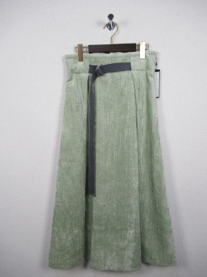 淡いグリーンのコーデュロイスカート。優しい色には綺麗な色のニットがよく似合う。ウエストを強調したスカートですがAラインのフェミニン要素たっぷりですが大人っぽさも感じられる雰囲気のあるスカートコーデ!
