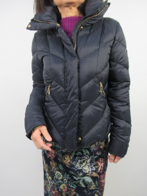 花柄が印象的なタイトスカートにパープルのリブニットを合わせました。柄物デザインを取り入れるときは他をシンプルでベーシック物で合わせると挑戦しやすいですね。色でトレンドを抑えると良いです。ショート丈のダウンコートで大人可愛いスタイルに!