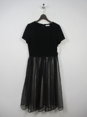 スカート部分がレースとチュールのドッキングがオシャレなワンピース。黒をベースにしたシックな色は大人のお出かけ着にとてもよく似合う。夏のお呼ばれに一着あると便利なワンピース!エレガンス度100%。