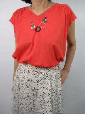 鮮やかなオレンジ色のブラウスは夏に向けて着たい一枚。涼しげなドット柄のスカートでエアリー感を出して!フェミニン度80%、エレガンス度20%。