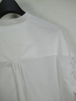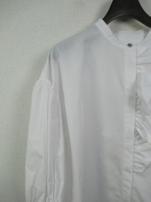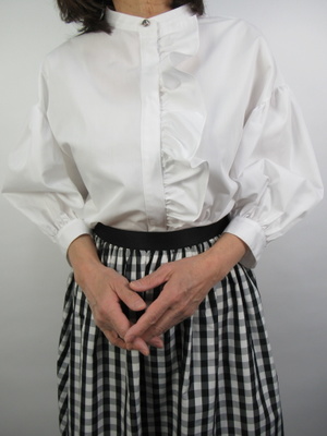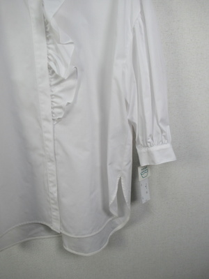ハリの有るシャツ生地のブラウス 前立フリルが特徴 前は下まで開きます ドロップショルダー ボリュームあり 7分袖 裾後ろ長め 背のところタックギャザー 手洗い可能