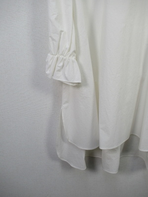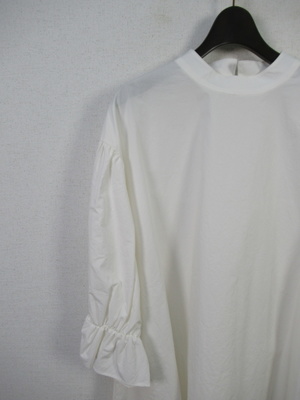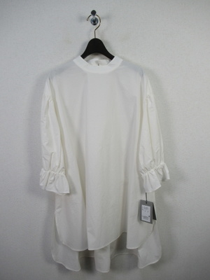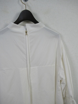 チュニック丈のブラウス ネックはスタンド ドロップショルダー 袖ゴムギャザー 後ろファスナー 手洗い可能