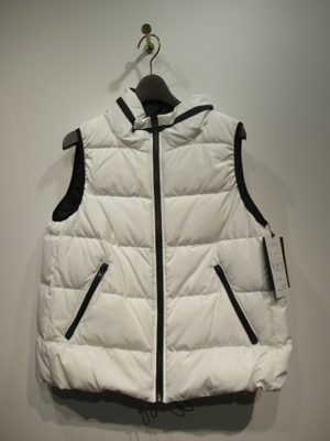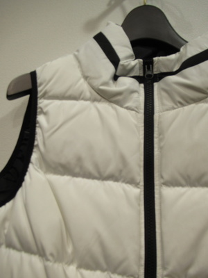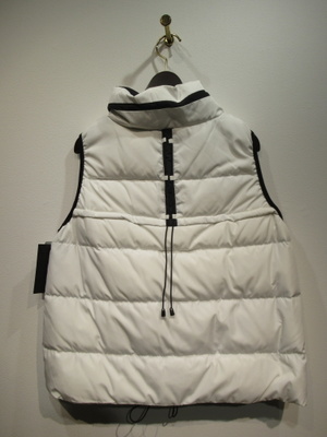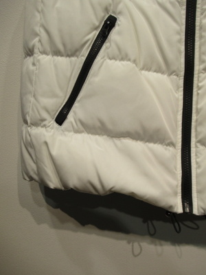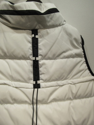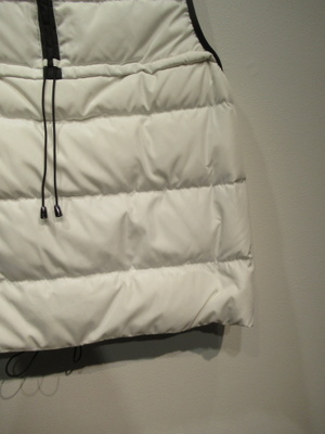 ダウンベスト、裾ドロスト、前ファスナー、後ろ飾りの紐あり
