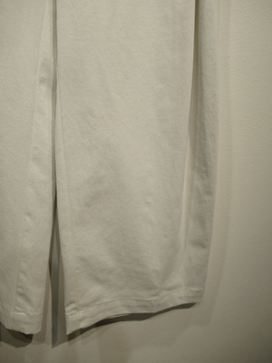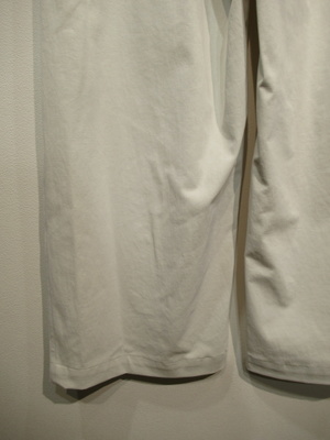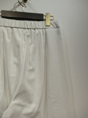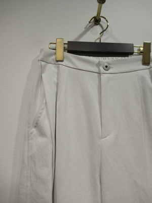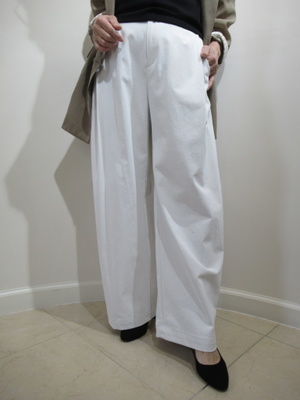 脇に近い部分のタックが入っている、太めのワイド、脇ポケットあり、裏地無し、前ファスナー、ウェスト後ろゴム、手洗い可能