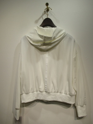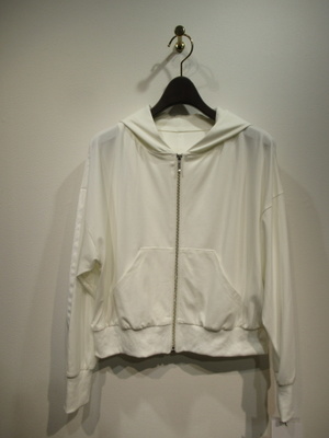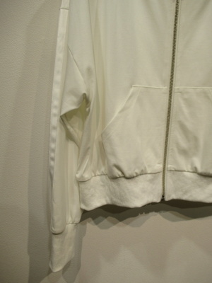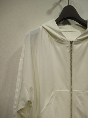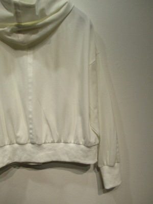 短丈のコンパクトなパーカー、ドロップショルダー、前開きファスナー(シルバー)、ポケットあり、裾・袖口リブ、肩山から袖口にかけて同色のグログランテープを施しています、手洗い可能