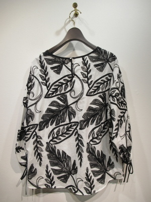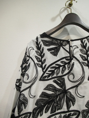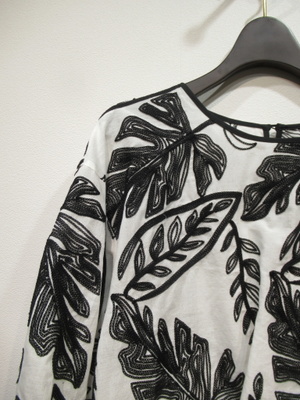 大きなボタニカル柄の刺繍(白は黒・黒は同色の刺繍糸)、ドロップショルダー、袖筒やや太め、袖筒玉縁の縁取りでギャザー、玉縁部分がリボン使い、前後差あり