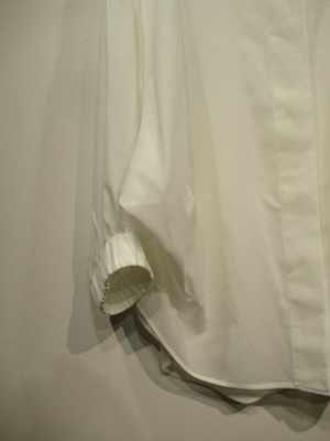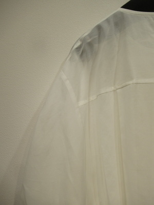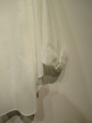 ドルマンスリーブ、襟無し、前開き比翼ボタン、袖口幅広ゴム入り、裾はラウンド型、手洗い可能