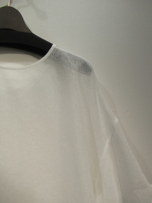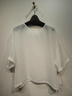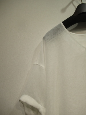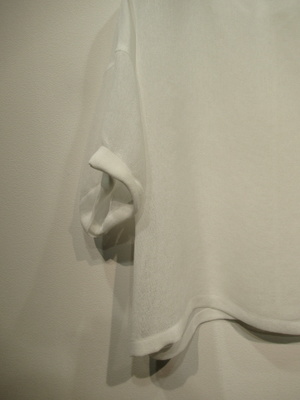 スクエアデザイン、後ろ身頃Vカット、ドロップショルダー、袖口ダブル、ガーゼ素材のような荒い目をした生地、前後着用可能、脇スリット入り、手洗い可能