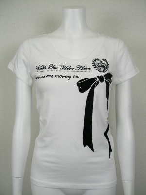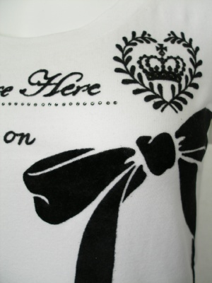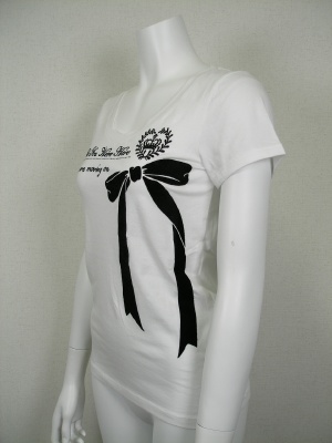 ロゴとリボンはフロッキーでやや起毛しています。ライストーンも使ってフェミニンな印象です。