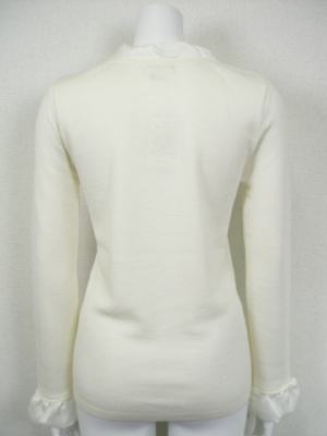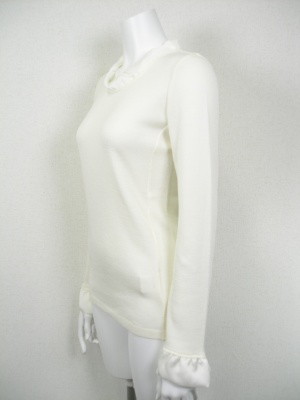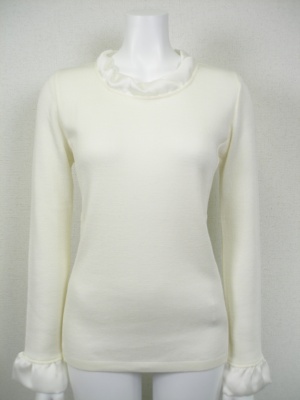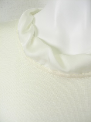 シンプルなニットのネックと袖口に、ポリエステルの別布をふわりと付けてあります。