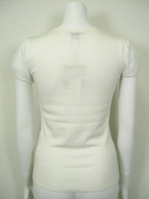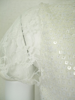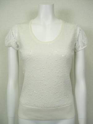 生地と同系色のスパンコールを散りばめてあり、お袖はレースを使ったフェミニンなニット。