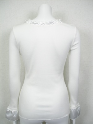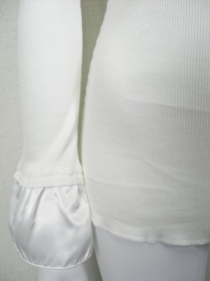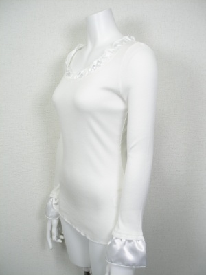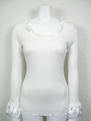 柔らかくフィットするカットソー。ネックラインと袖口のサテン(ポリエステル)がアクセント。