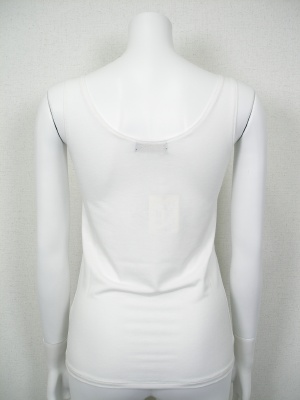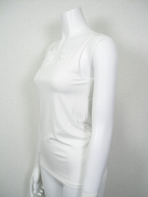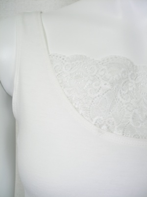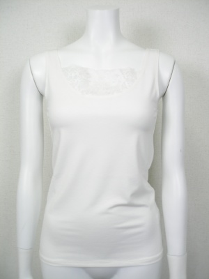 胸元のレースがポイントのタンクトップ。レースも含めてストレッチが効いているので着やすく、重ね着してもかさばりません。