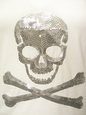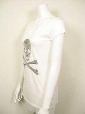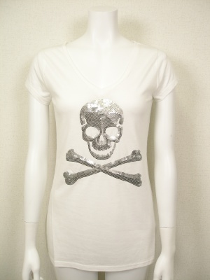 スパンコールのスカルがインパクト!Vネックで少し長め丈の、大人に似合うTシャツです。