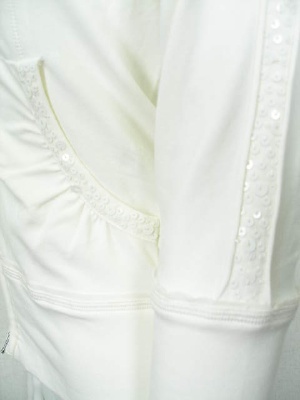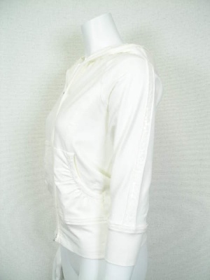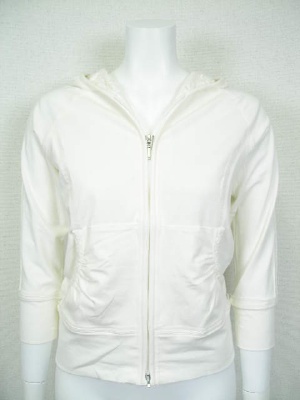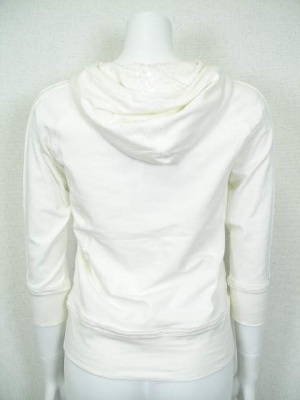 袖やポケットにはライン状に、フードの内側にはびっしりとラインストーンが付いています。ストレッチ素材のコンパクトなパーカです。