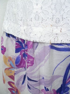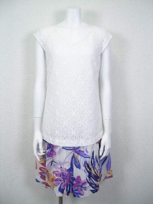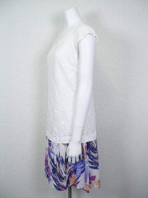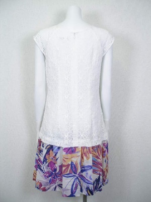 レースのチュニックと花柄スカートを合わせた「トリックワンピース」。裏地付きなので一枚でもお召し頂けます。