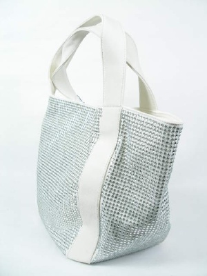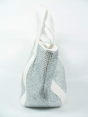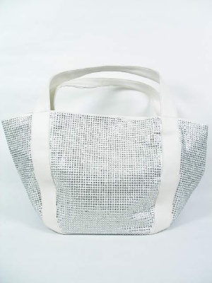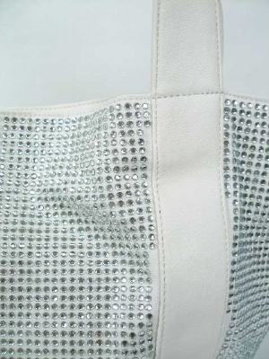 キャンバス地にラインストーンがびっしり。持ち手の無地部分は合皮です。