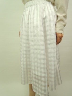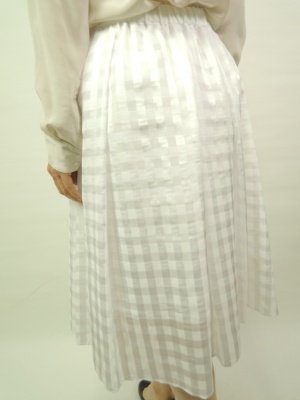 ウエストゴム、ギャザースカート 裏地有、表の生地はあえて長めにして透け感を活かすデザイン。大きなギンガムチェック柄が印象的、ウエストゴムで2サイズ展開
