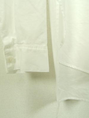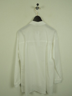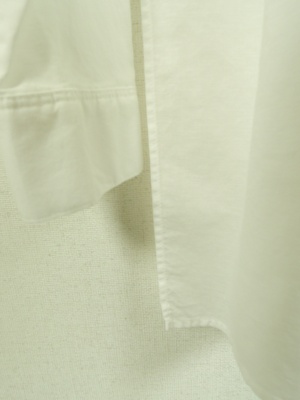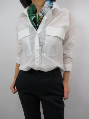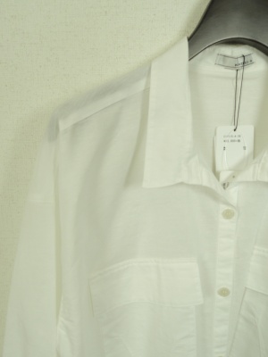 ビッグシルエットシャツ、胸元の大きなポケットが印象的で、前上がりのデザイン、後ろにギャザータック有り、手洗い可能