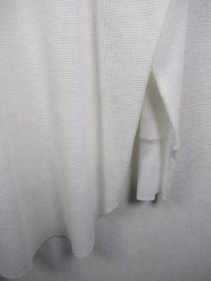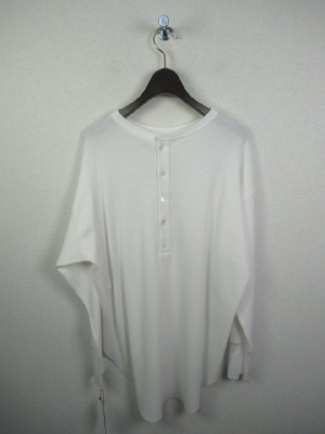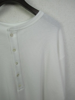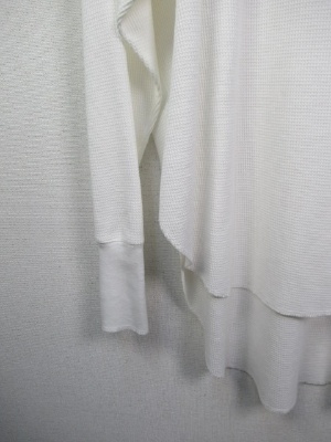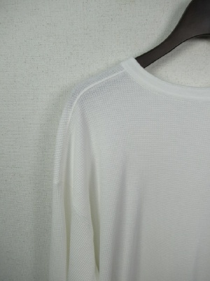 ワッフル生地のシンプルカットソー、ややビッグシルエット、後ろボタン、前後差有り、ドロップショルダー