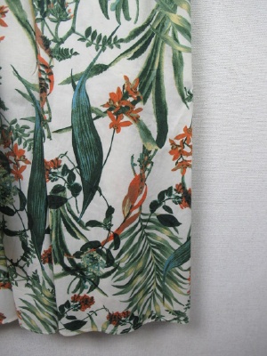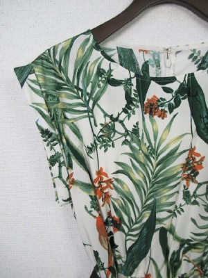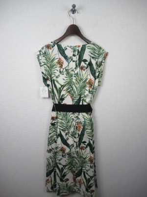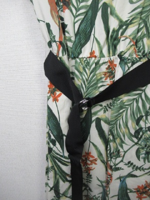 ボタニカル柄 ウエストゴムのワンピース ペチコート付き 後ろファスナーうえストに5cm幅のグログランテープベルト付き(黒) 手洗い可能