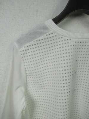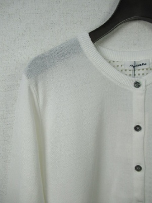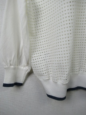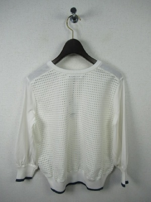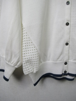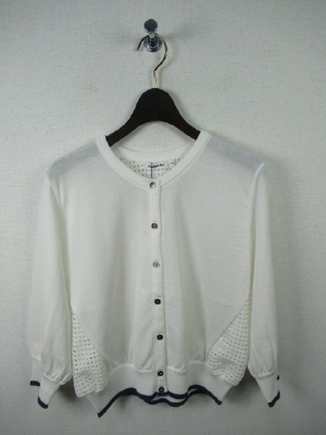 後ろ身ごろから裾あたりの前にかけて異素材のパンチング生地 クルーネックのカーデ 7分袖 袖口にライン入り 白はネイビー ネイビーはグリーン 手洗いOK