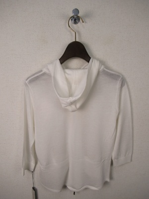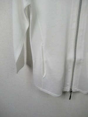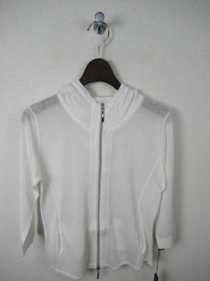 シルバーファスナー(ダブルジップ)の七分袖パーカ、手洗い可能、透け感のある生地、裾はラウンド、袖口リブ