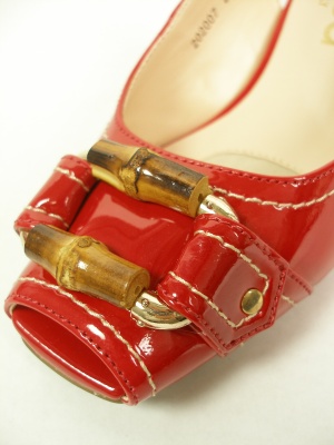 バンブーのバックルがポイント、オープントゥのバックストラップパンプス。