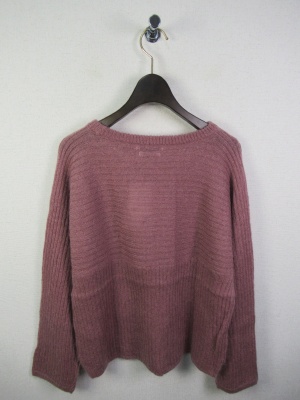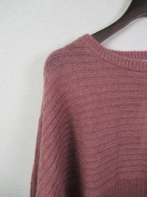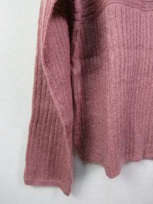 少し毛足の長い糸 編み地は畦編みを身ごろの中央で変えて上半身から袖は横 下半身は縦になる