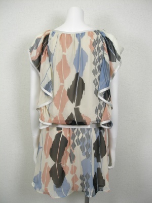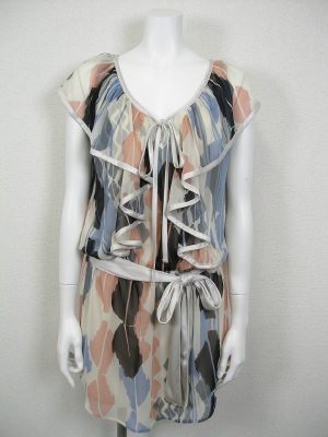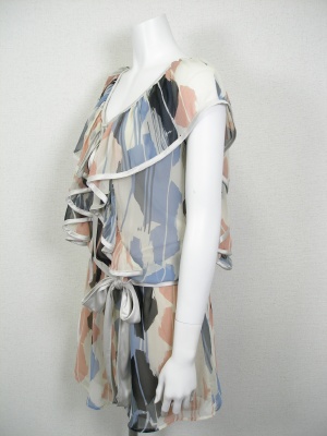 肩から前後に流れるようなフリルが印象的なワンピース。ローウエストのゴムで自然にブラウジングし、その上にリボンベルトを。シフォンですが裏地が付いているので一枚でもお召しいただけます。