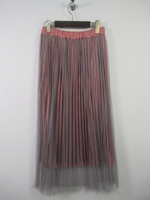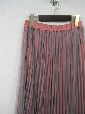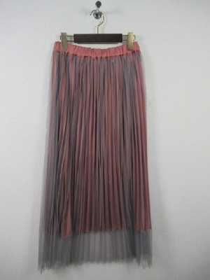 プリーツスカートにチュールスカートが2枚合わせになったデザイン、ウェストゴム、チュール部分はロングスカートくらいの長さです、ピンクはライトグレーのチュール