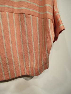 襟無しドルマン袖のシャツ、前開き(比翼)、第一ボタンはシルバー、前後差あり、コクーンタイプ、手洗い可能、ベージュ系の柄