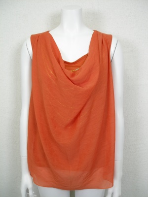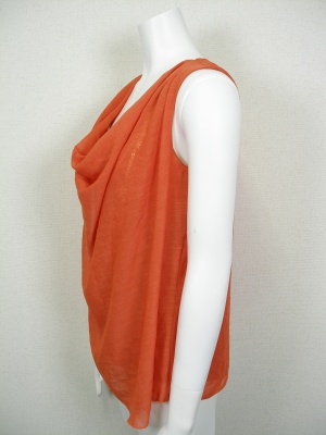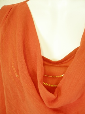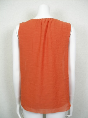 スパンコールをネックレスのように付けたリヨセル70%・綿30%のカットソーに、サラリとしたブラウス生地を重ねています。