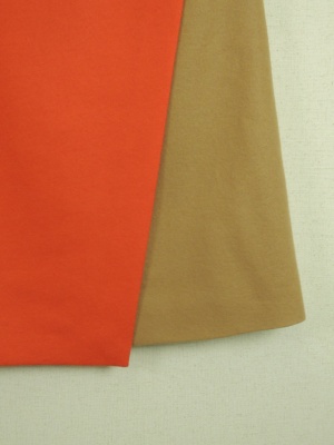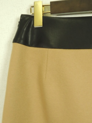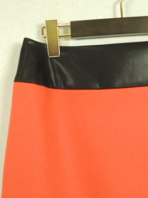 ヒップハング台形スカート ウエストは合皮の配色使い 前見頃はラップ式で2色使いの生地 ややオレンジの生地が斜めカットで裾も斜めカットで内側より少し長めになってます 裏地あり 横ファスナー