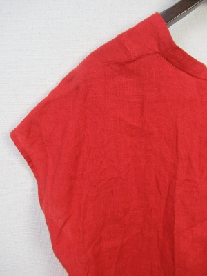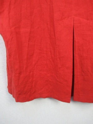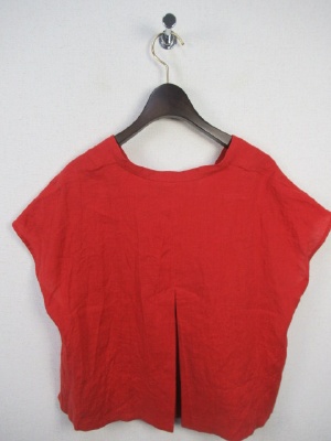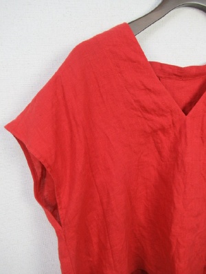 Vネックのフレンチ袖ブラウス かぶりタイプ 後ろに一か所タック入り 丈感は短いですがウエストマークのボトムによく合う、フロントインしなくていいので楽です 麻ですが洗いがかかって柔らかな風合い 手洗い可能