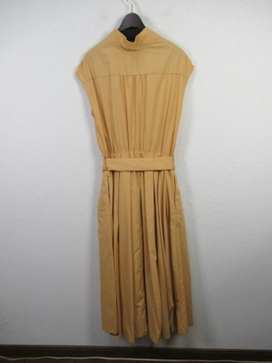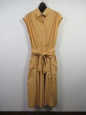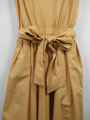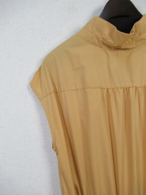 プルオーバーのシャツワンピース 襟はスタンド フレンチ袖 フロントスキッパー襟 ウエスト総ゴムギャザースカート スカート部分は裏地付き 共生地のリボン生地脇ポケット 手洗い可能