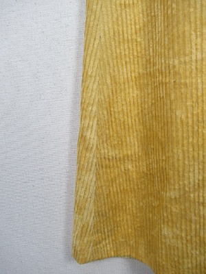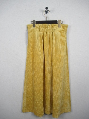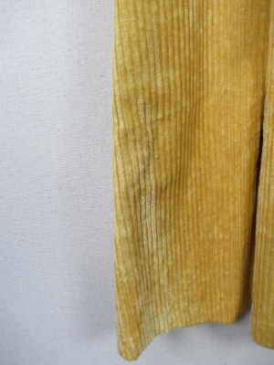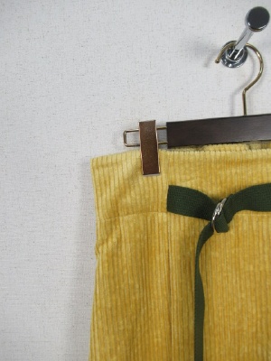 太い畝のコーデュロイ ウエスト後ろゴム入り フロントにタック有り そこにベルトでアクセント 横ファスナー 裏地あり くるぶし上の丈 ややハイウエスト
