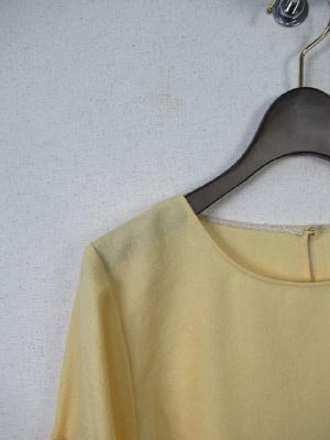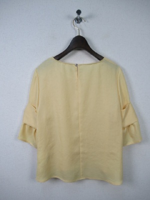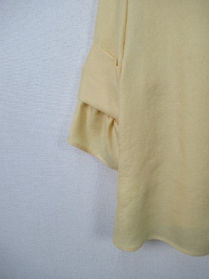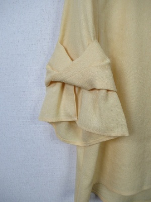 お袖部分はやや広がってます、切り替えでリボンのようなデザイン、裾は前上がりでラウンド、後ろボタン、手洗い可能